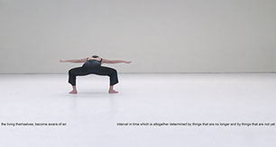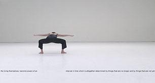 In relation to the ethos of the Bauhaus and how its revolutionary potential might pertain to the contemporary moment I appropriated a fragment of text from Hannah Arendt’s essay The Gap Between Past And Future. In the latter Arendt describes an interval between past and future in which the living can become challengers, taking “a stand against past and future”. In my photograph (a film still from a danced choreography to camera that responds to the building plan of Eileen Gray’s Villa E.1027) the dancer’s body occupies the idea of Arendt’s metaphorical interval: a gap that allows for the possibility to think and act anew. Through juxtaposition of text and image, Arendt’s interval is set in tension with the dancer’s embodiment of Gray’s architecture. Gray worked both with and against the precepts of modernism to open onto uncharted modes of design and living. The architectural horizon line in my photograph references Villa E-1027’s maritime location and for me enacts the idea of a fulcrum between the seen and the as yet unseen.